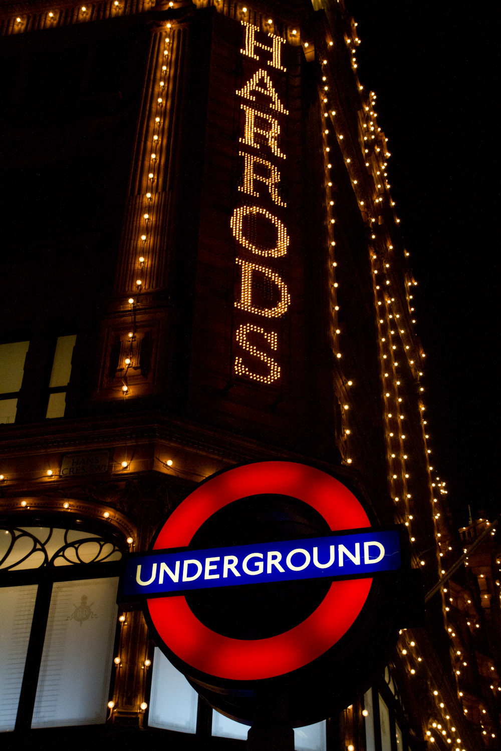 La gran tienda por departamentos de Londres, Harrod’s, en Knightsbridge, con su imponente iluminación nocturna, y un letrero del Underground o Tube, el metro de Londres, al lado.