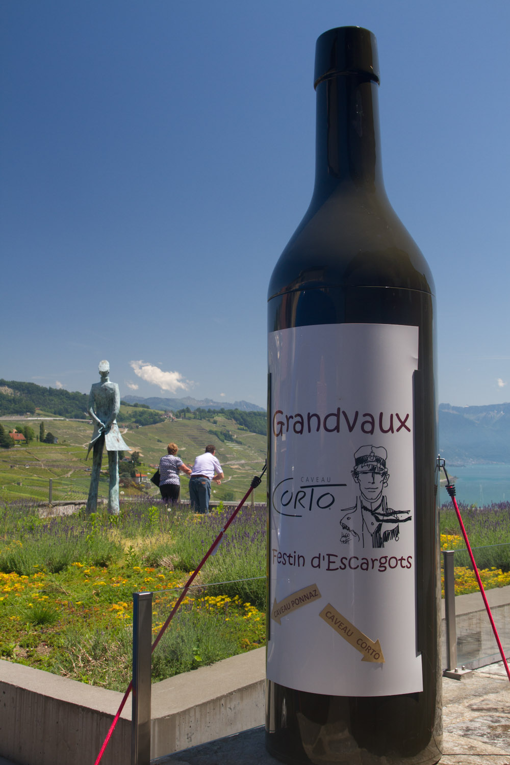 Estatua de Corto Maltés y representación de botella de vino en Grandvaux, Suiza
