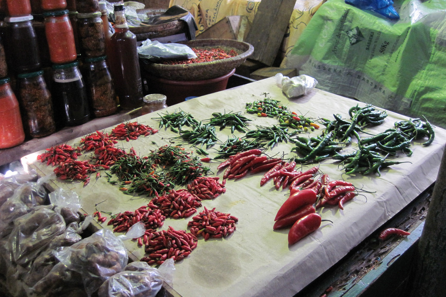 Una buena variedad de pimientos en el mercado de Maputo, Mozambique. Tienen pinta de ser bastante picantes.