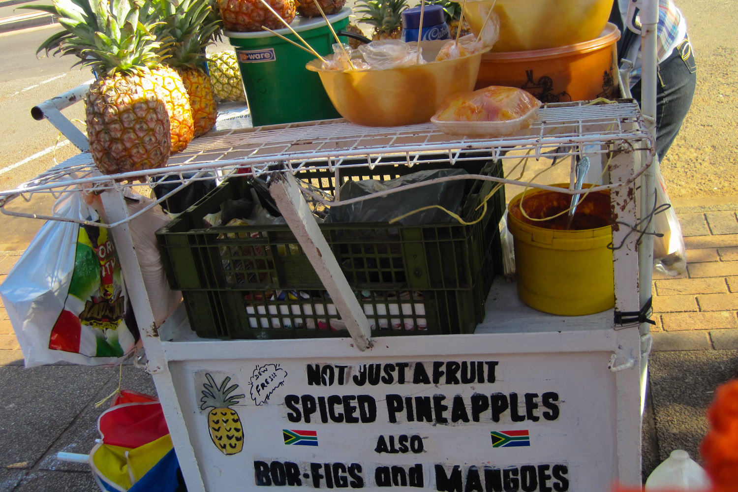 Un carrito de piñas con especias y otras frutas exóticas en la Milla Dorada, el paseo marítimo de Durban, Sudáfrica.