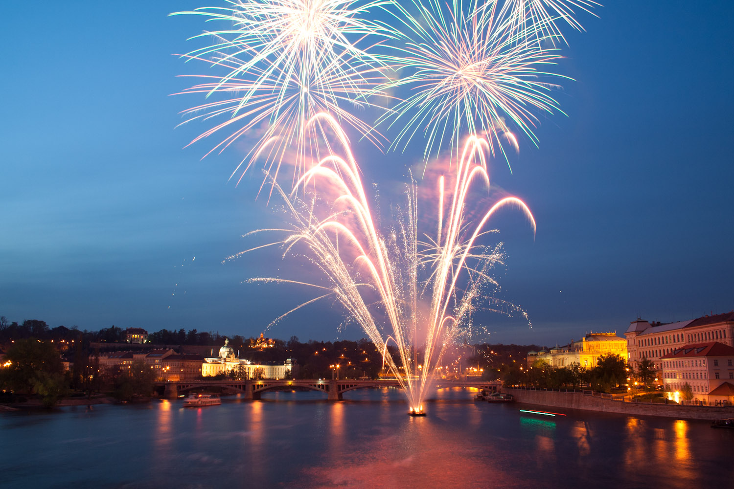 Fuegos artificiales sobre el río Moldava, Praga, República Checa